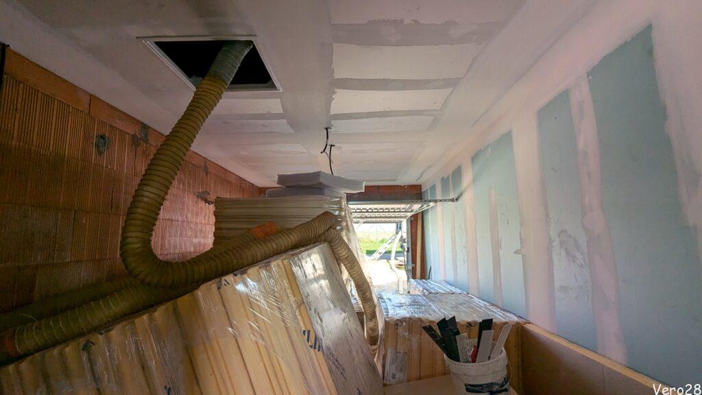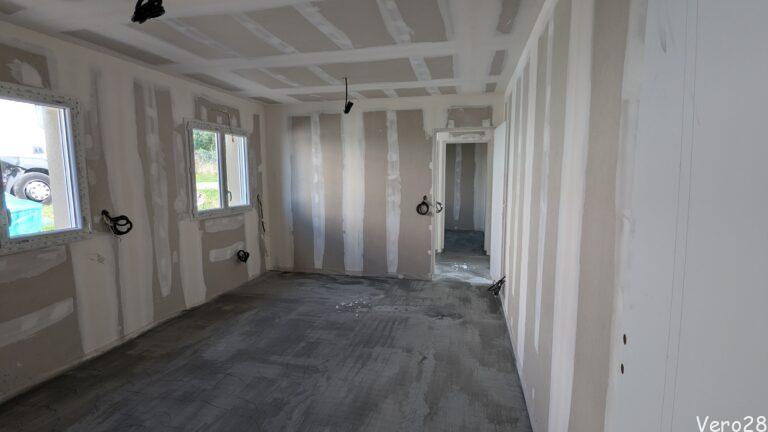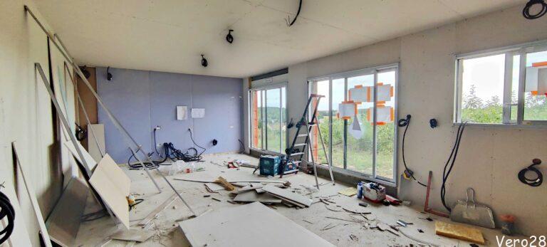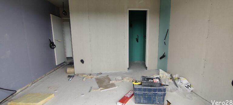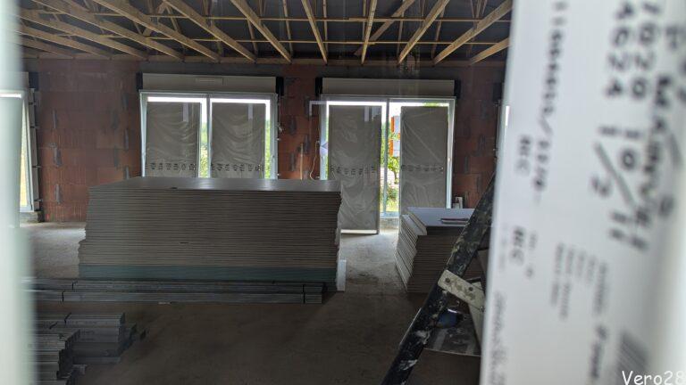 A jednak ktoś w sierpniu pracuje. Miła niespodzianka. Realizowane są najcięższe prace: montaż sufitu, stelaży, drzwi i płyt g-k. Gipsowanie zostanie na wrzesień.