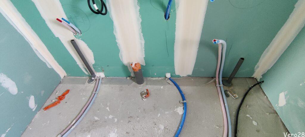 Hydraulik wykonał pierwsze prace. Niestety niezgodnie z projektem. Miejsca do których dociągnął wodę zimną i ciepłą, gdzie w przyszłości mają być podtynkowe baterie do wanny i prysznica mijają się z projektem. Jest to tym bardziej oburzające, że dostał od nas dokładne rysunki techniczne, jak mają wyglądać obie łazienki i gdzie mają być elementy podtynkowe.