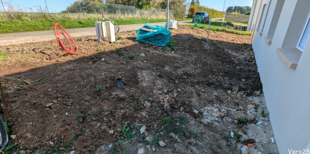Dzień robót ziemnych wokół domu: układanie peszli dla sieci elektrycznej, telekomunikacyjnej, wodociągowej, domofony, ściekowej oraz instalacja tunelu filtrującego, do którego zostaną podłączone rynny. W efekcie prawie cały ogródek został przekopany.