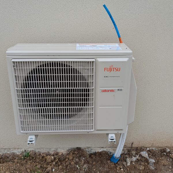 Na zdjęciu widać element zewnętrzny pompy ciepła. Okazuje się, że do podłączenia przewodów z czynnikiem chłodniczym musi przyjechać inny specjalista, w naszym przypadku będzie to ktoś z firmy Engie, znanego dostawcy prądu.
